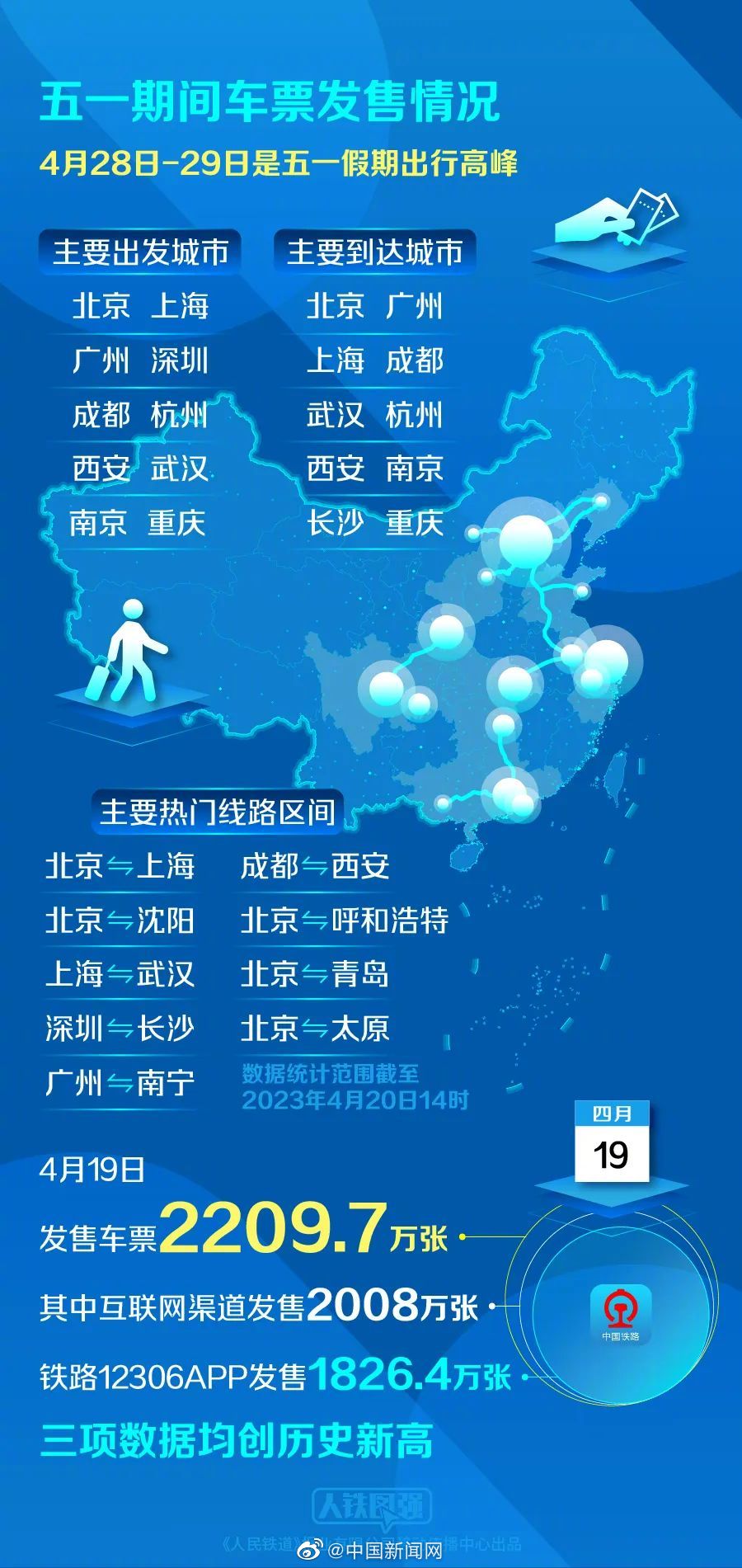 根据中国铁路公众号发布的五一期间全国车票发售情况,4月28日-29日是五一假期出行高峰,主要到达城市有北京、广州、上海、成都、武汉、杭州、西安、南京、长沙、重庆。你会选择五一期间出游吗?你心仪的目的地是哪?