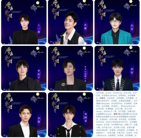2023湾区升明月阵容:成龙、徐小凤、汪明荃liza、主持人蓝羽、吳京、蘇有朋、劉乃奇、陳貝兒、郭洋子Yoko、庞玮、阿云嘎Musical、艾敬、白安ANN、草蜢官方微博、常石磊、陈慧珊、陈慧娴Priscilla、陈松伶_AdiaChan、董荞、杜德偉、杜江侦察记、杜天宇嘟嘟嘟、范世錡xxxF、费翔、耿乐、古巨基LeoKu、关晓彤、时代少年团-贺峻霖、演员胡先煦、华晨宇yu、黄渤、黄嘉乐Kalok、吉克隽逸、贾静雯、江疏影、蓝盈莹Lyric、李彩华rainli李彩桦、李晨、李克勤、李沁、李现ing、李宇春、李玉刚、梁漢文edmond、林保怡、林曉峰lo、刘德华、刘浩存、刘惜君、刘雅瑟、摩登兄弟刘宇宁、柳岩、盧冠廷音樂人、卢靖姗CelinaJade、吕良伟Ray、毛晓彤、莫华伦、任達華、容祖儿、SupperMoment、苏运莹、谭维维、汪小敏、王心妤macau、UNIQ-王一博、王祖藍、魏大勋、溫碧霞irenewan、温拿乐队譚詠麟AlanTam钟镇涛彭健新wynners溫拿葉智強温拿陈友、温兆伦、乌尔善、伍思凯、冼靖峰ArchieSin、X玖少年团肖战DAYTOY、许靖韵Angela、许嵩、炎明熹Gigi、顏人中、楊千嬅、于适Yosh、宇宙人乐团、郁可唯、MikE曾比特、曾黎、张柏芝、张靓颖、张婉清之一、张卫健、章子怡、赵传、赵小婷Pamela、赵雅芝、郑恺、钟楚曦、周柏豪Pakho、周笔畅、周海媚、卡布叻_周深、Eric周興哲、周旋周詠琁、胡一虎、霍启刚、吴波、吴志华、肖建峰、孙照龙、郑欣、周家俊、劳礼澳、许智群等百余位电影人、音乐人、文体科技界代表齐聚,在中国香港,为大湾区而歌。