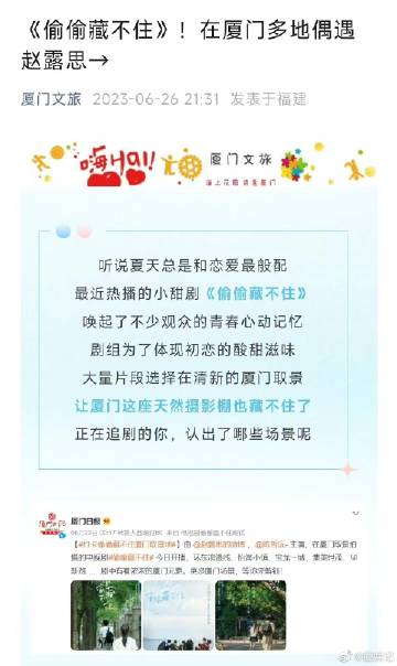 还有谁不知道《偷偷藏不住》是在厦门取景拍摄的,厦门文旅都喊你偶遇赵露思,体验鹭岛风情,打卡影视剧取景地,品尝闽南风味美食……