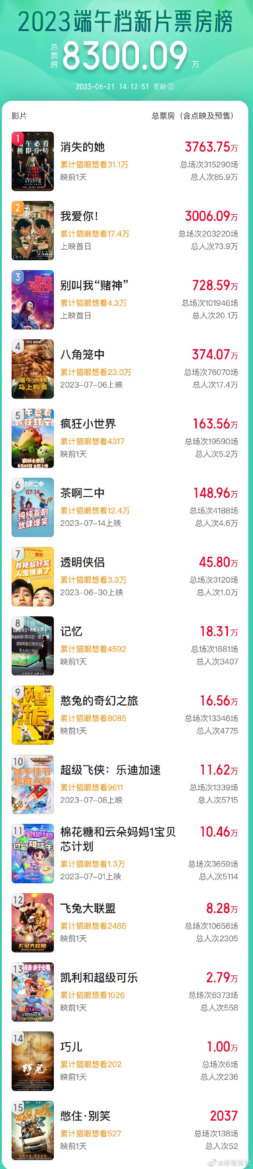 据灯塔专业版实时数据,截至6月20日17时40分,2023年端午档新片预售总票房(含点映)达到5631.7万元,共计有15部影片将在端午档展开竞争,其中《消失的她》《我爱你!》《八角笼中》分列票房预售榜前三位。