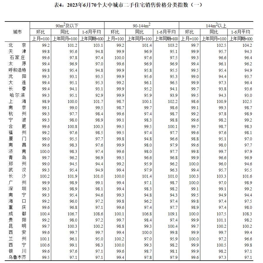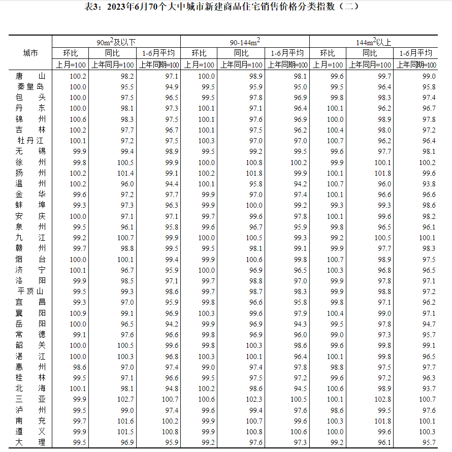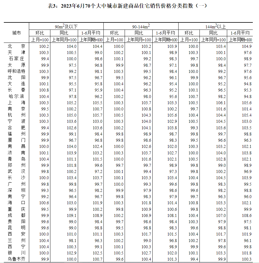 表1:2023年6月70个大中城市新建商品住宅销售价格指数
