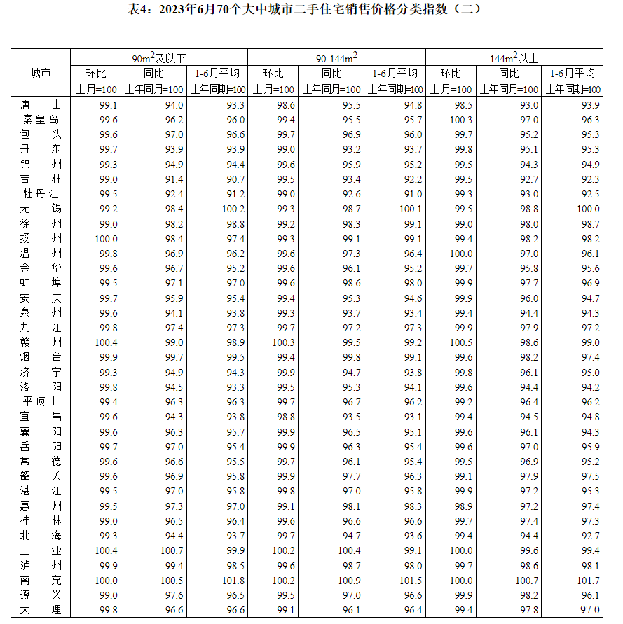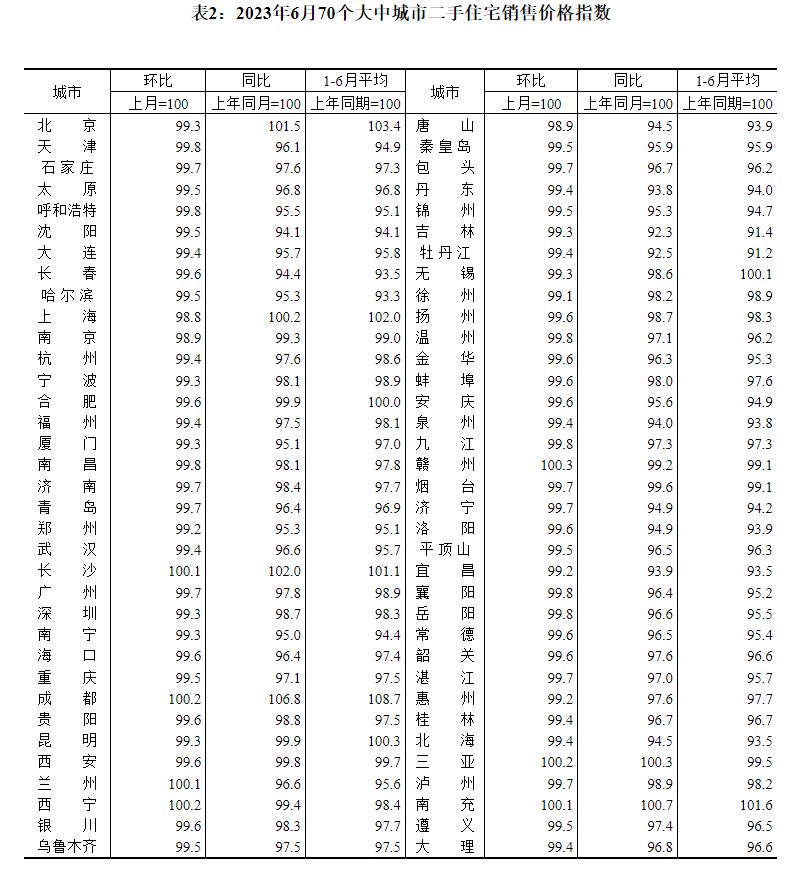 表2:2023年6月70个大中城市二手住宅销售价格指数