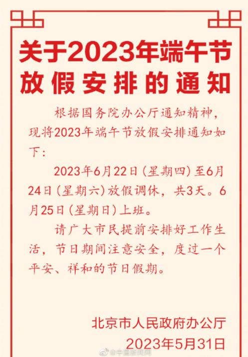 北京市人民政府办公厅31日发布“关于2023年端午节放假安排的通知”:2023年6月22日(星期四)至6月24日(星期六)放假调休,共3天。6月25日(星期日)上班。