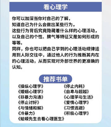 看心理学,你可以加深当你对自己的了解,知道自己为什么会做出某些行为,这些行为背后究竟隐藏着什么样的心理活动,以及自己的个性、脾气等特征又是如何形成的等等。同样,你也可以把自己学到的心理活动规律运用到人交往中,通过他人的行为推断其内在的心理活动,从而实现对外部世界的更准确的认知。