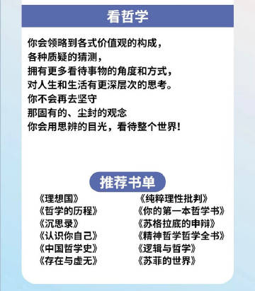 看哲学,你会领略到各式价值观的构成,各种质疑的猜测,拥有更多看待事物的角度和方式,对人生和生活有更深层次的思考。你不会再去坚守那固有的、尘封的观念你会用思辨的目光,看待整个世界!