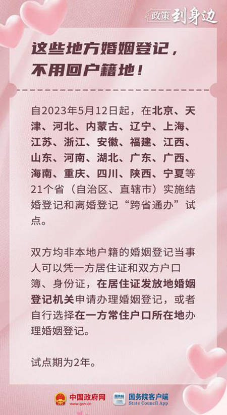 日前,国务院批复同意扩大内地居民结婚登记和离婚登记“跨省通办”试点。在这21个省(自治区、直辖市)双方均非本地户籍的婚姻登记当事人可凭一方居住证和双方户口簿、身份证,在居住证发放地婚姻登记机关申请办理婚姻登记,或者自行选择在一方常住户口所在地办理婚姻登记。