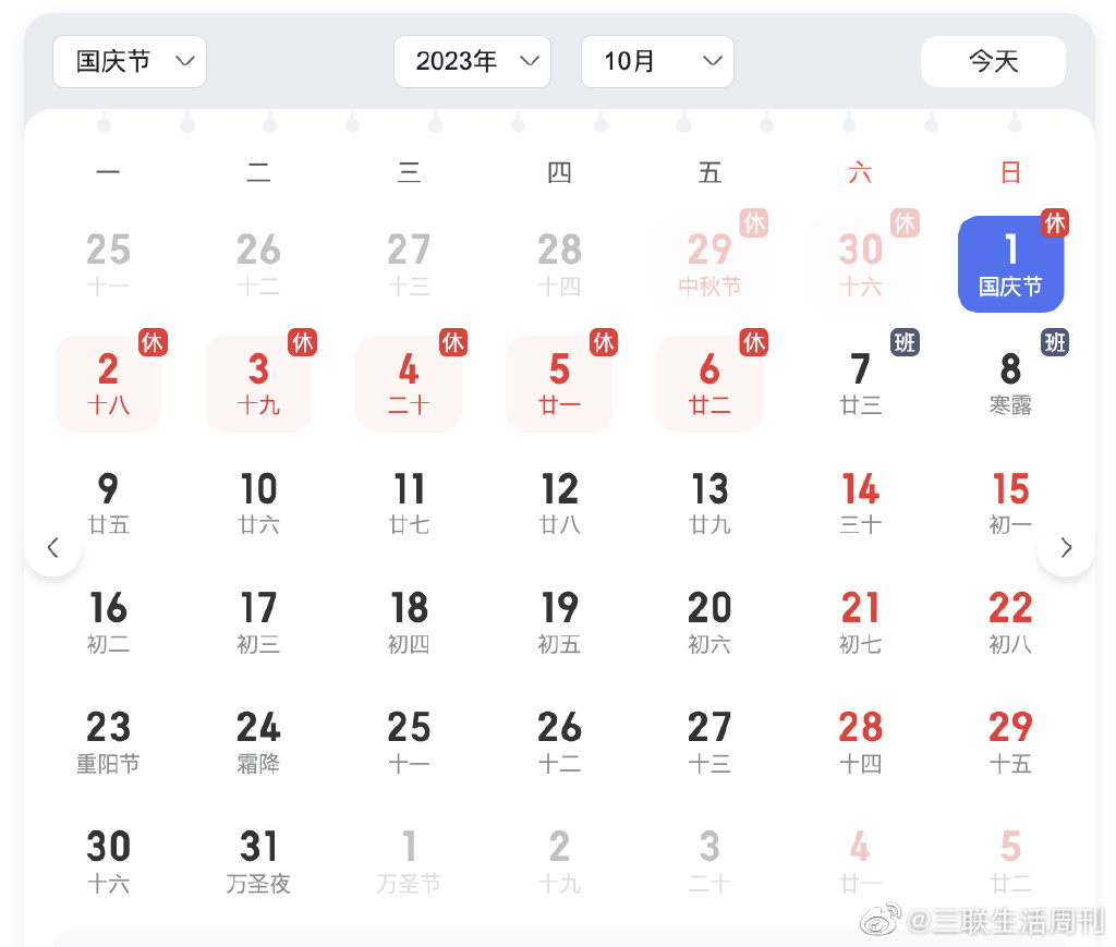端午回来,2023年只剩一个法定节假日了——中秋节、国庆节:9月29日至10月6日放假调休,共8天。10月7日(星期五)10月8日(星期六)上班。