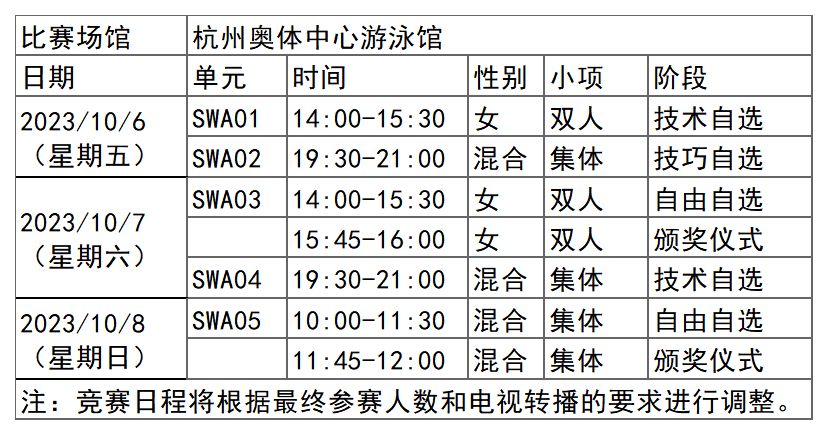 杭州亚运会花样游泳项目比赛时间为10月6日-8日,在杭州奥体中心游泳馆举行,共产生2枚金牌。