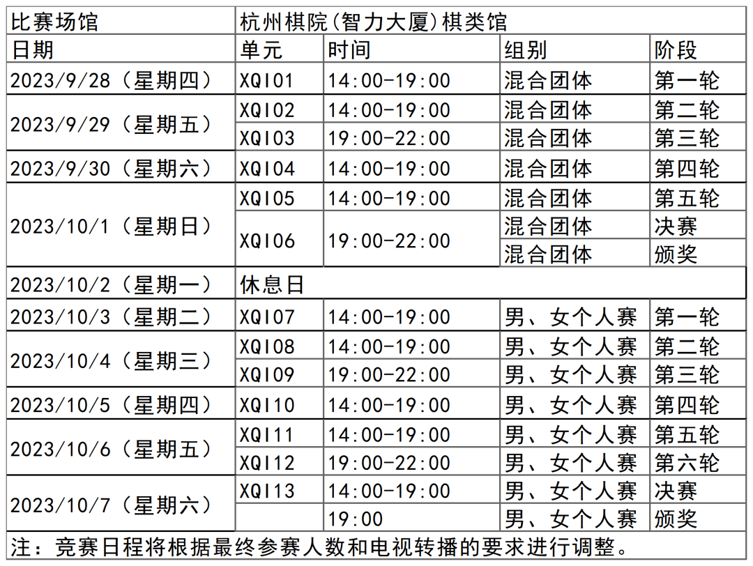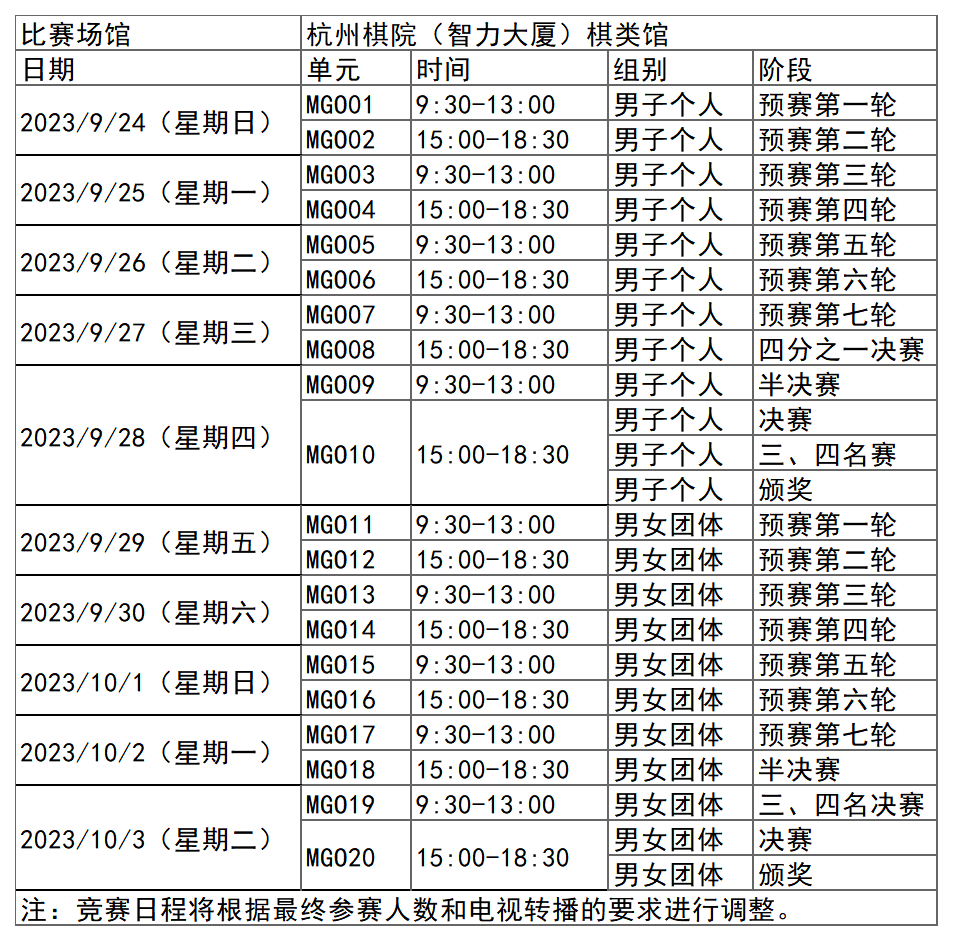 杭州亚运会围棋项目比赛时间为9月24日-10月3日,在杭州棋院(智力大厦)棋类馆举行,共产生3枚金牌。