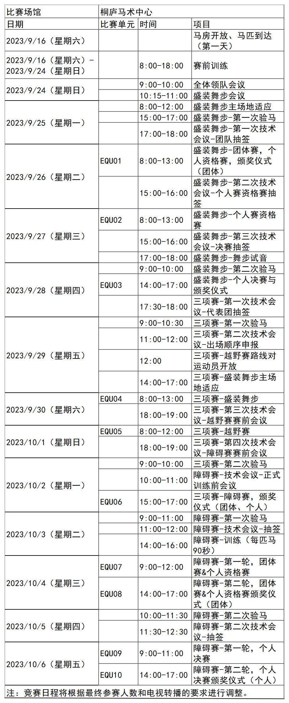 杭州亚运会马术项目比赛时间为9月26日-10月6日,在桐庐马术中心举行,共产生6枚金牌。