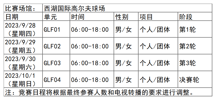 杭州亚运会高尔夫球项目比赛时间为9月28日-10月1日,在西湖国际高尔夫球场举行,共产生4枚金牌。