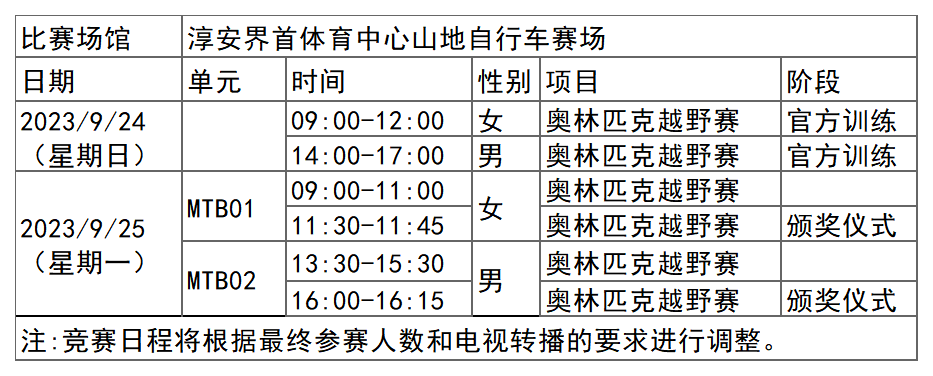 杭州亚运会山地自行车项目比赛时间为9月25日,在淳安界首体育中心山地自行车赛场举行,共产生2枚金牌。