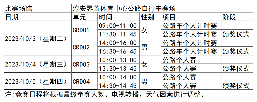 杭州亚运会公路自行车项目比赛时间为10月3日-5日,在淳安界首体育中心公路自行车赛场举行,共产生4枚金牌。