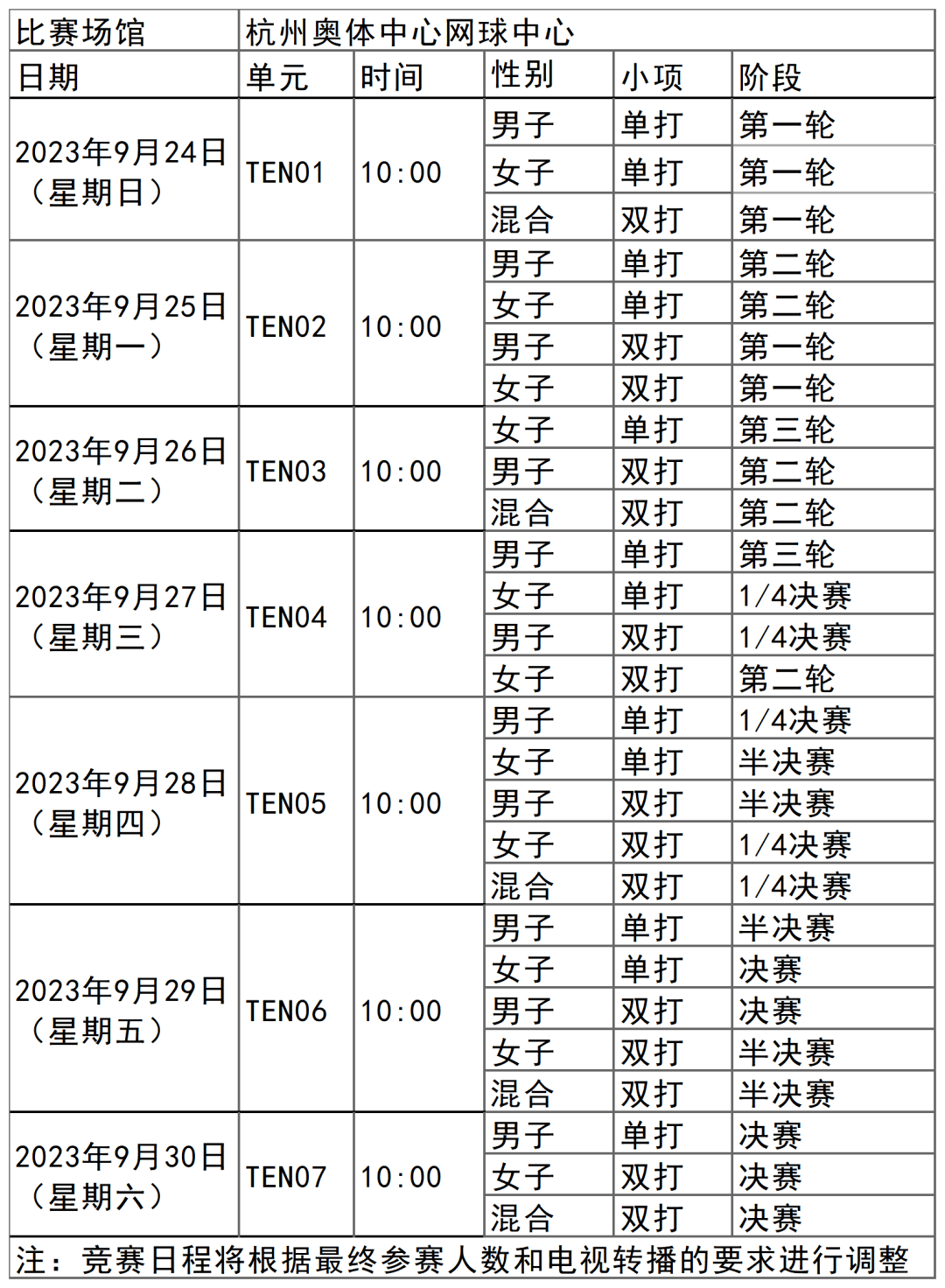 杭州亚运会网球项目比赛时间为9月24日-30日,在杭州奥体中心网球中心举行,共产生5枚金牌。