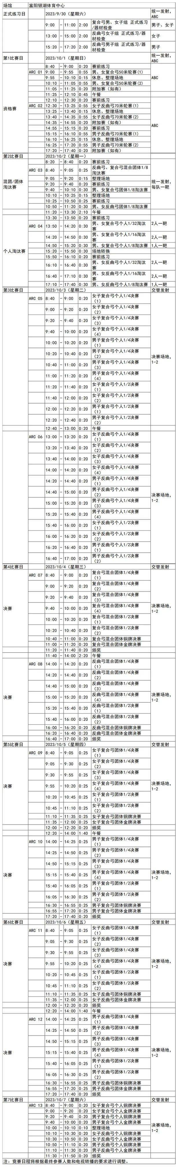 杭州亚运会射箭项目比赛时间为10月1日-10月7日,在富阳银湖体育中心举行,共产生10枚金牌。