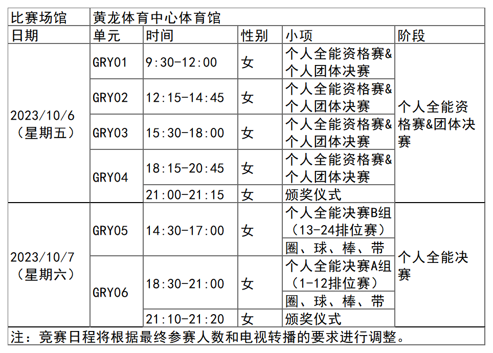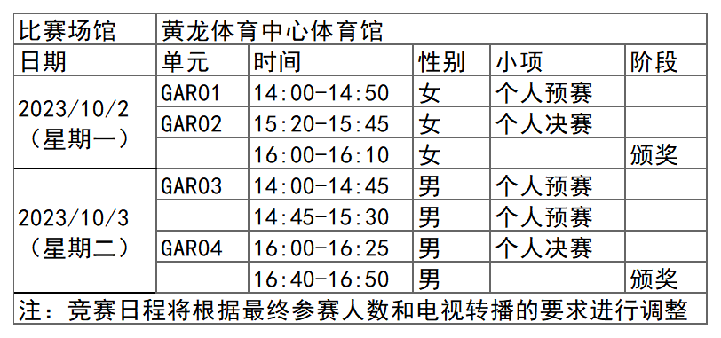 杭州亚运会艺术体操项目比赛时间为10月6日-7日,在黄龙体育中心体育馆举行,共产生2枚金牌。