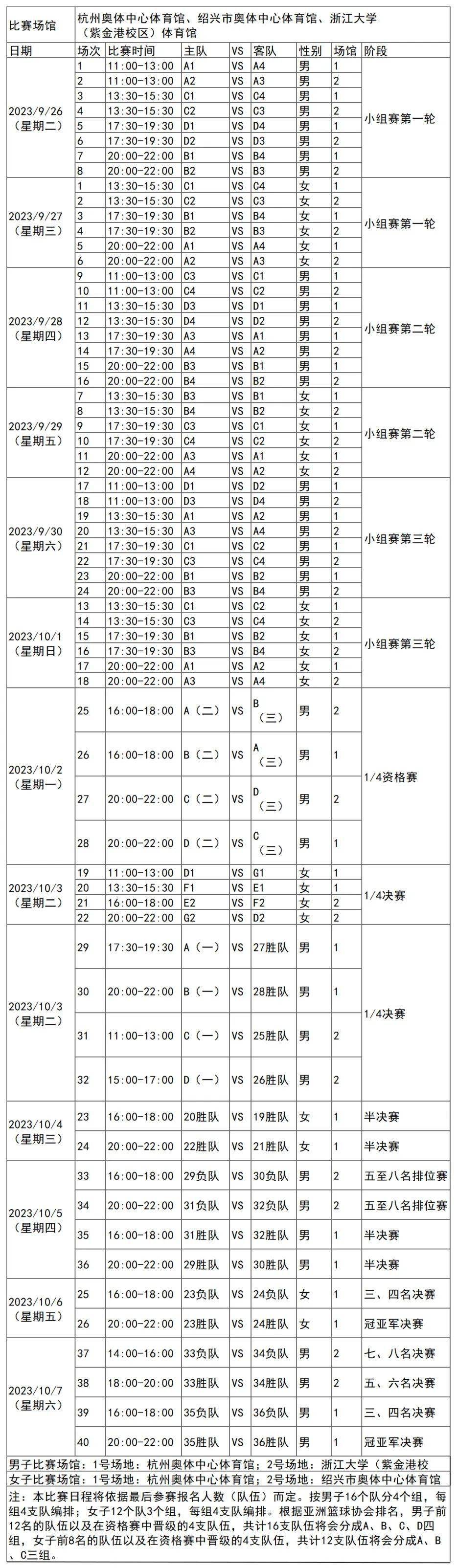 杭州亚运会篮球项目比赛时间为9月26日-10月7日,在杭州奥体中心体育馆、浙江大学(紫金港校区)体育馆、绍兴奥体中心体育馆举行,决赛在杭州奥体中心体育馆举行,共产生2枚金牌。