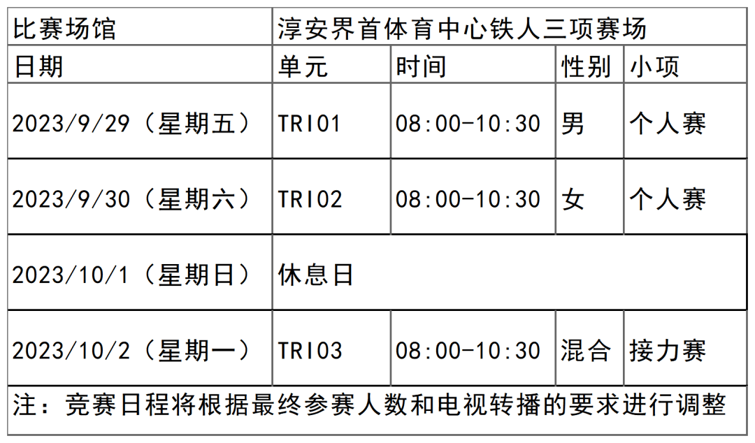 杭州亚运会铁人三项项目比赛时间为9月29日-10月2日,在淳安界首体育中心铁人三项赛场举行,共产生3枚金牌。