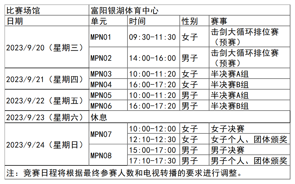 杭州亚运会现代五项项目比赛时间为9月20日-24日,在富阳银湖体育中心举行,共产生4枚金牌。