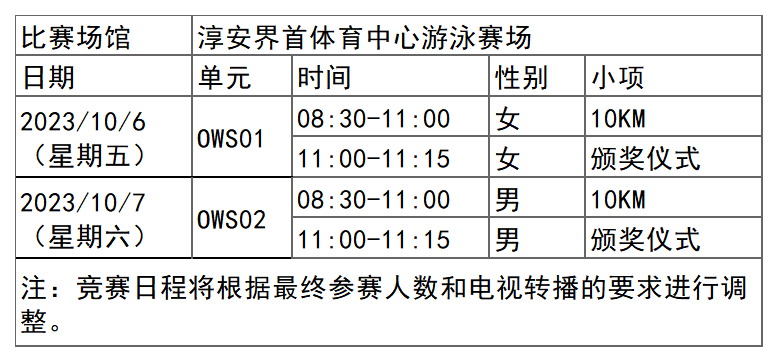 杭州亚运会马拉松游泳项目比赛时间为10月6日-7日,在淳安界首体育中心游泳赛场举行,共产生2枚金牌。