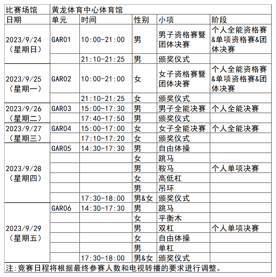 杭州亚运会竞技体操项目比赛时间为9月24日-29日,在黄龙体育中心体育馆举行,共产生14枚金牌。
