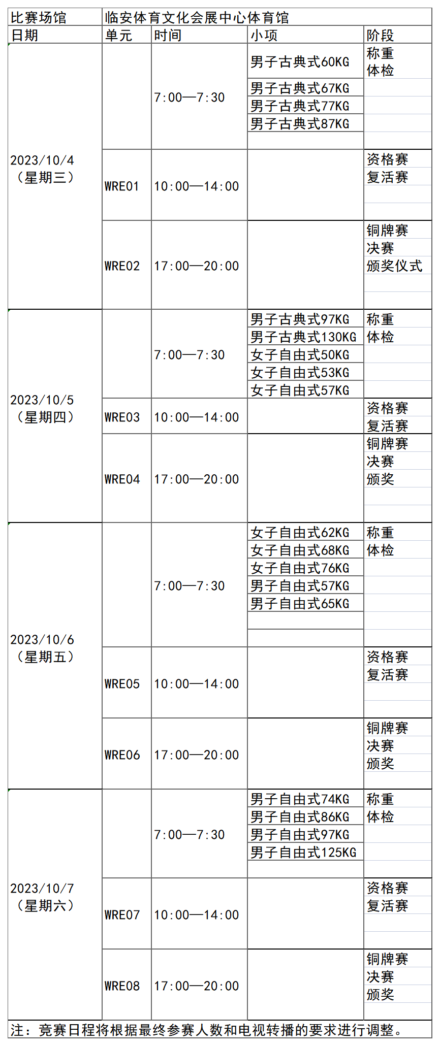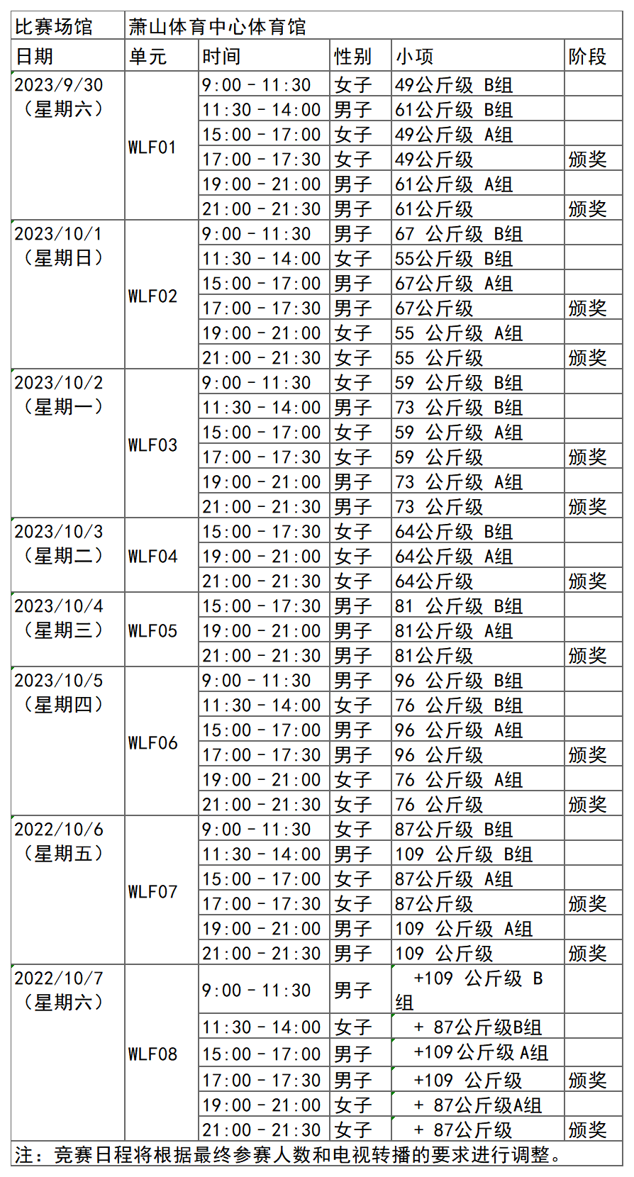 杭州亚运会举重项目比赛时间为9月30日-10月7日,在萧山体育中心体育馆举行,共产生14枚金牌。
