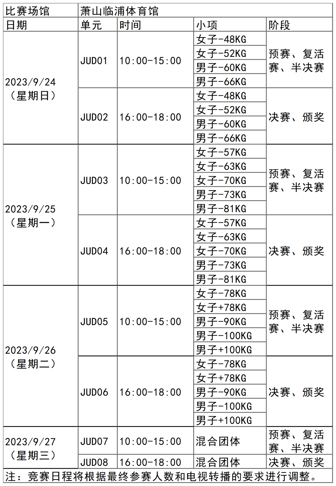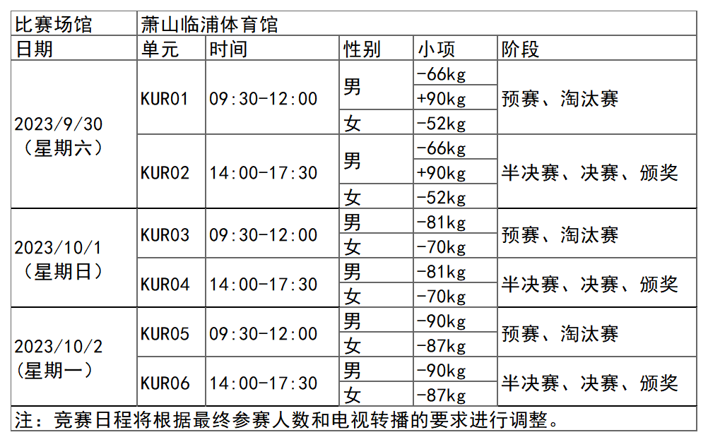 杭州亚运会柔道项目比赛时间为9月24日-27日,在萧山临浦体育馆举行,共产生15枚金牌。