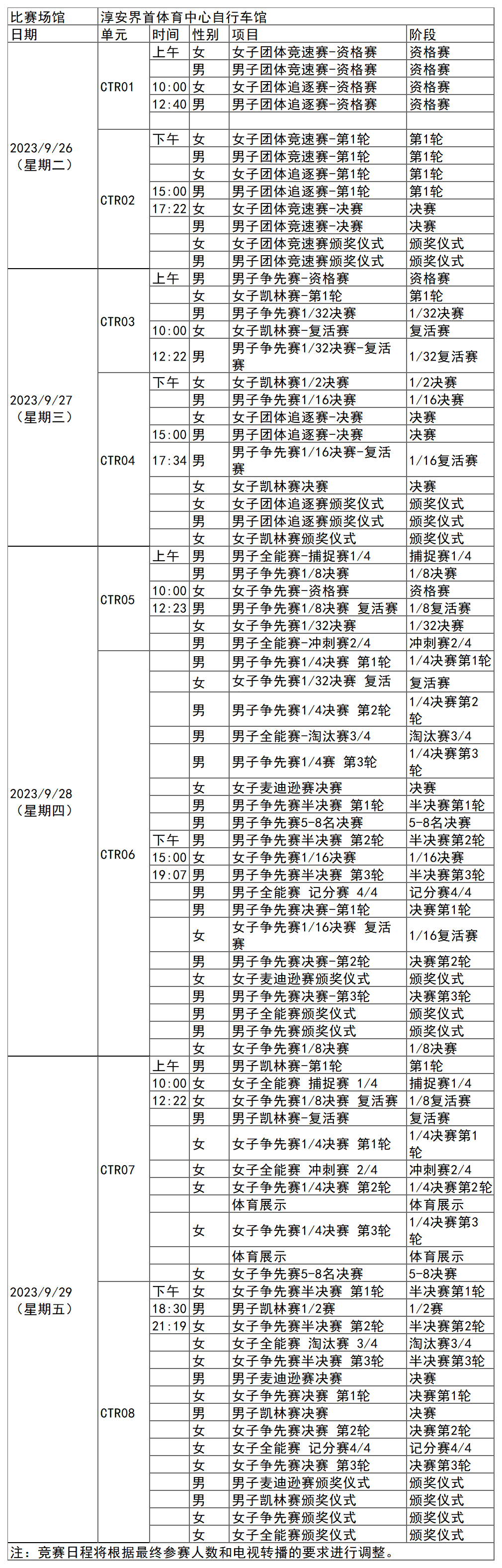 杭州亚运会场地自行车项目比赛时间为9月26日-29日,在淳安界首体育中心自行车馆举行,共产生12枚金牌。