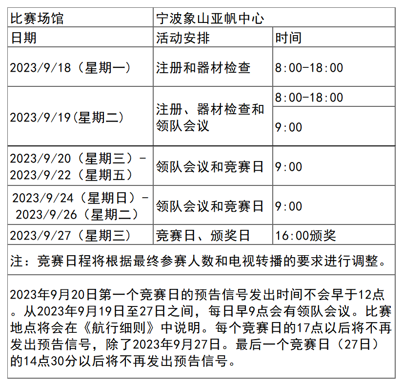 杭州亚运会帆船项目比赛时间为9月20日-27日,在宁波象山亚帆中心举行,共产生14枚金牌。
