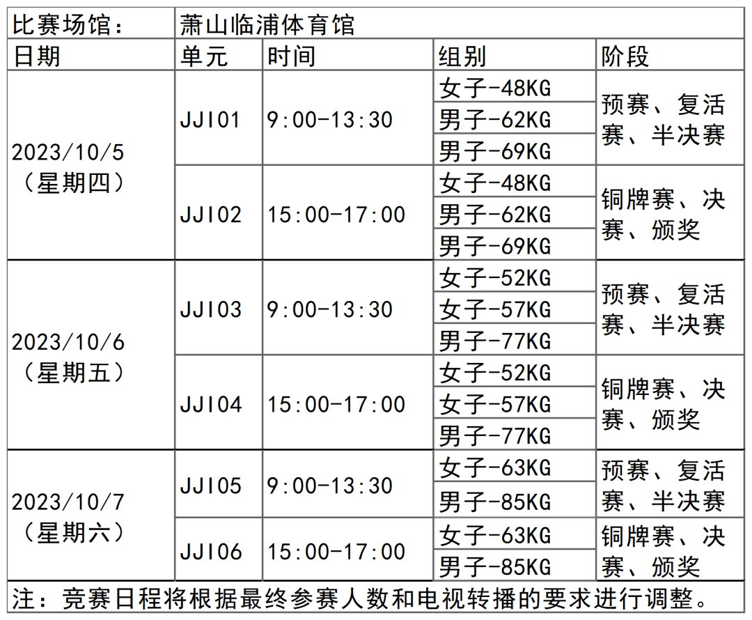 杭州亚运会柔术项目比赛时间为10月5日-7日,在萧山临浦体育馆举行,共产生8枚金牌。