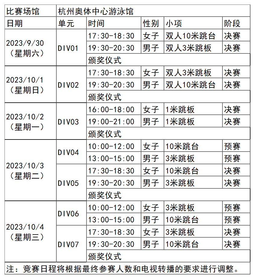 杭州亚运会跳水项目比赛时间为9月30日-10月4日,在杭州奥体中心游泳馆举行,共产生10枚金牌。