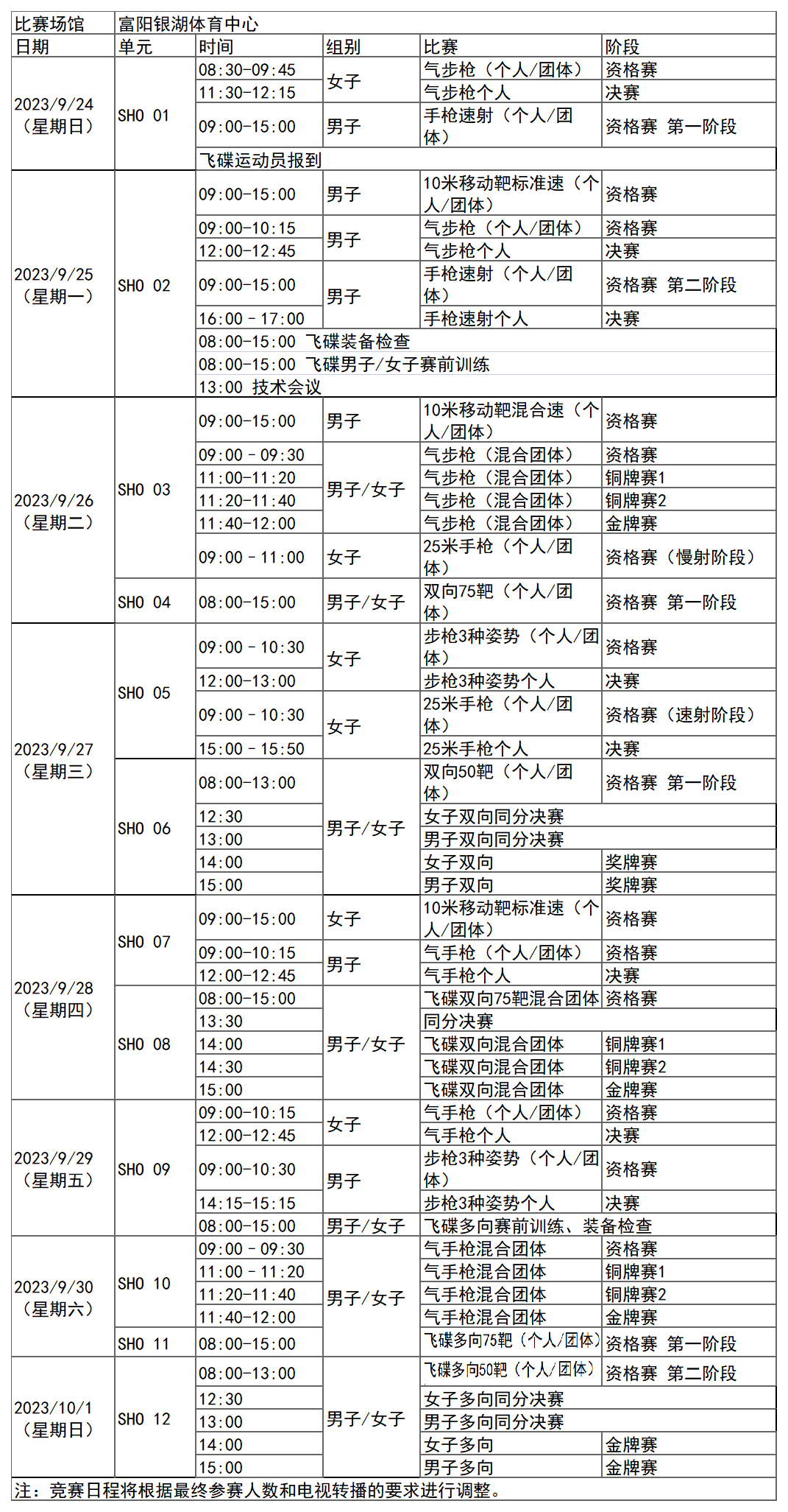 杭州亚运会步枪、手枪、飞碟项目比赛时间为9月24日-10月1日,在富阳银湖体育中心举行,共产生33枚金牌。