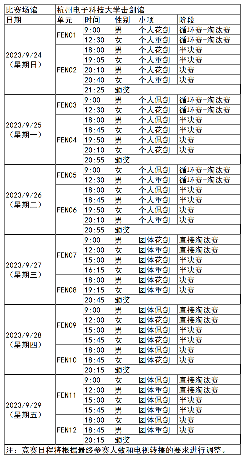 杭州亚运会击剑比赛场地设在杭州电子科技大学体育馆,赛期6天,共设花剑、重剑、佩剑三个剑种的男子和女子的个人及团体12个小项比赛,共计产生12枚金牌。杭州亚运会击剑比赛执行国际击剑联合会击剑规则。