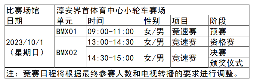 杭州亚运会竞速小轮车项目比赛时间为10月1日,在淳安界首体育中心小轮车赛场举行,共产生2枚金牌。