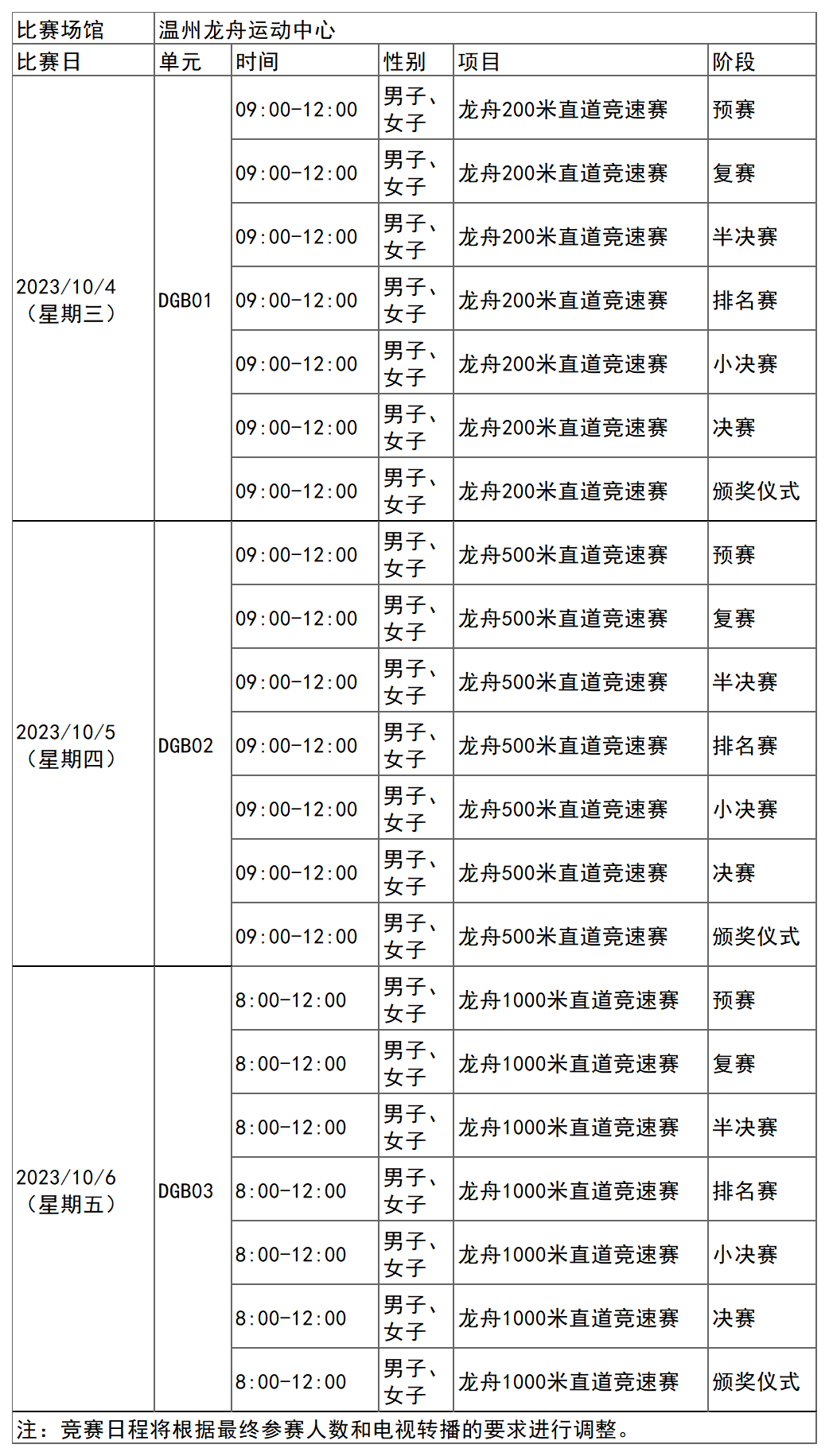 杭州亚运会龙舟项目比赛时间为10月4日-6日,在浙江温州龙舟运动中心举行,共产生6枚金牌。