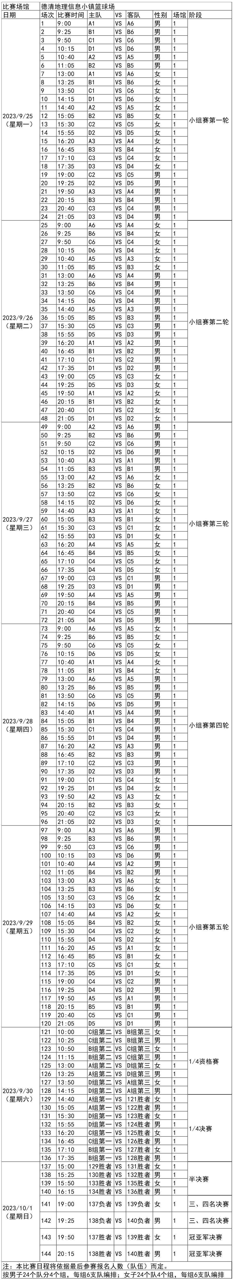 杭州亚运会三人篮球项目比赛时间为9月25日-10月1日,在德清地理信息小镇篮球场举行,共产生2枚金牌。