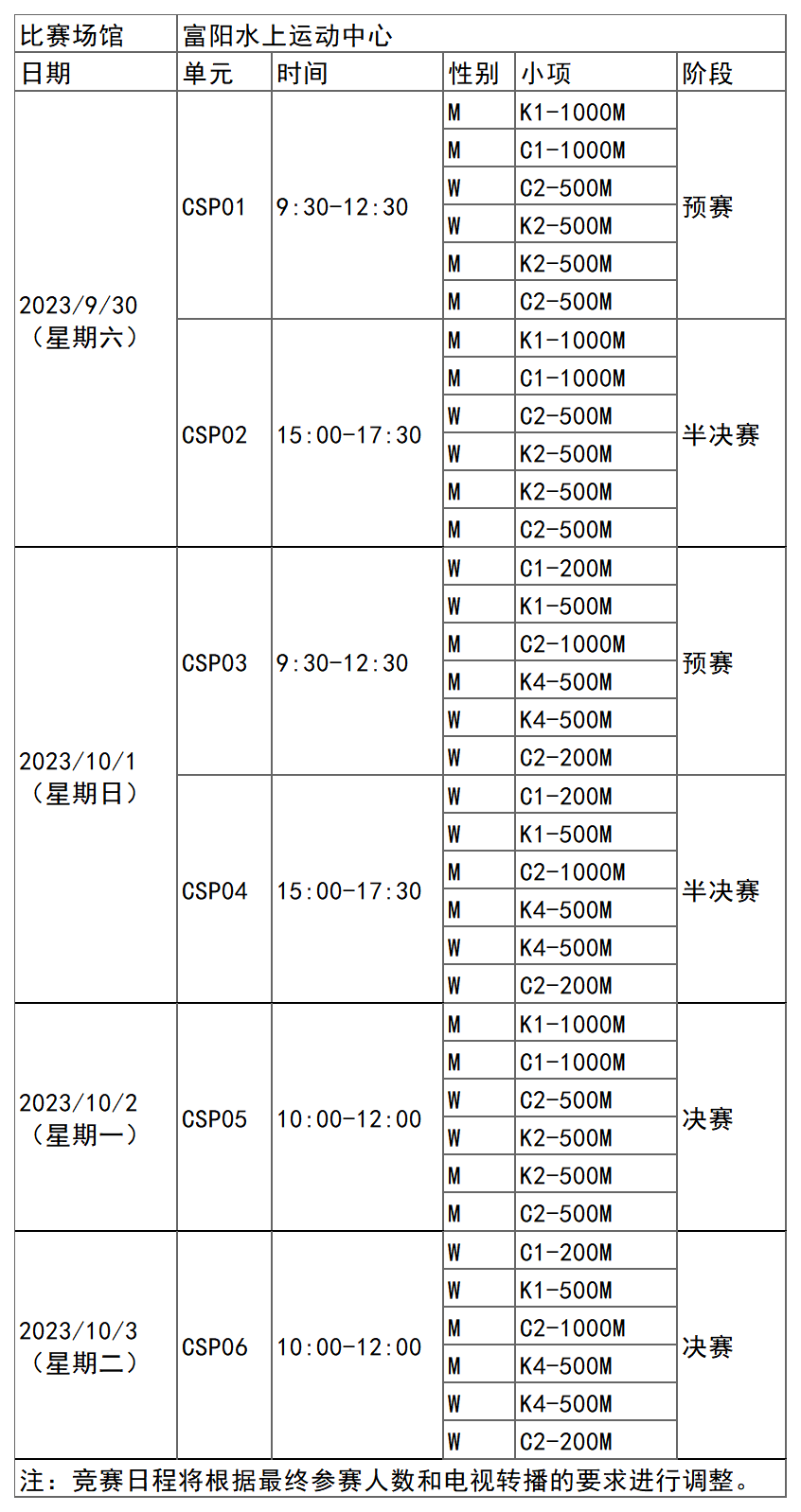 杭州亚运会皮划艇静水项目比赛时间为9月30日-10月3日,在富阳水上运动中心举行,共产生12枚金牌。