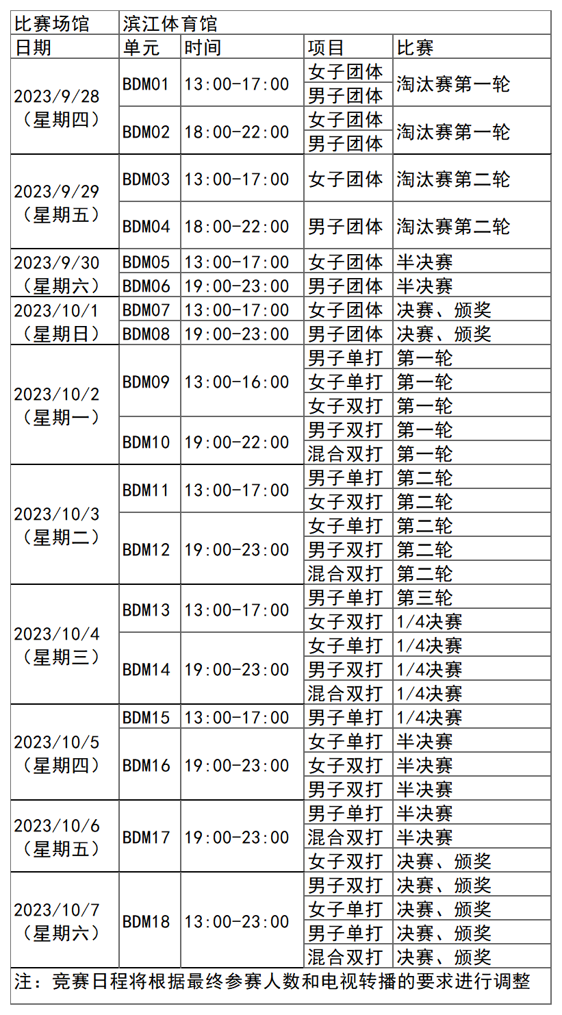 杭州亚运会羽毛球项目比赛时间为9月28日-10月7日,在滨江体育馆举行,共产生7枚金牌。