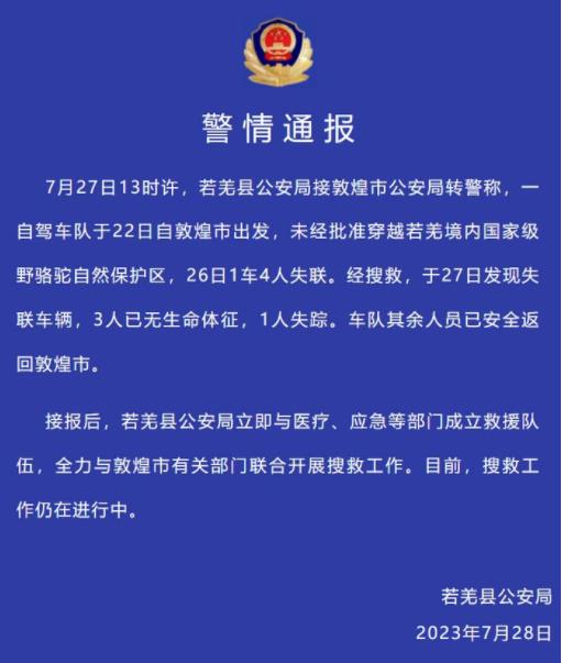 28日,警方通报称,22日一自驾车队自敦煌市出发,未经批准穿越若羌境内保护区。26日,1车4人失联,27日发现失联车辆,3人无生命体征,1人失踪。业内人士称,新疆罗布泊国家级野骆驼自然保护区夏季高温,地表最高温度可达70摄氏度左右。
