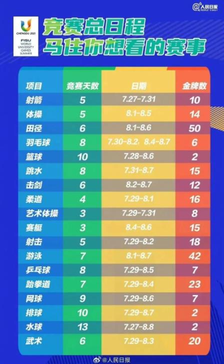 本届大运会共设置射箭、体操、田径、羽毛球、篮球、跳水、击剑、柔道、艺术体操、赛艇、射击、游泳、乒乓球、跆拳道、网球、排球、水球和武术18个竞赛项目,共将产生269枚金牌。