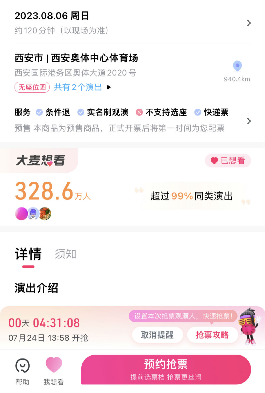 4、【预售时间】本场演出的正式预售时间为2023年7月24日13点58分;